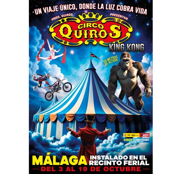 El Gran Circo Quirós aterriza en Málaga con un espectáculo que fusiona lo mejor del circo tradicional y las últimas novedades artísticas. Más de 30 artistas, animales sorprendentes y acrobacias impresionantes captarán toda tu atención. ¡Un show lleno de magia y adrenalina en vivo para toda la familia!