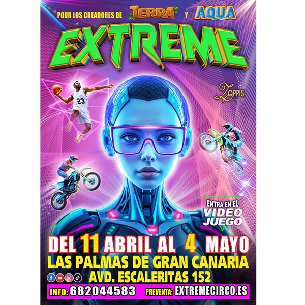La innovación y la emoción se unen en "Extreme", el nuevo espectáculo de Zoppis Productions, creadores de éxitos como CirCuba, Aqua Circo y Terra Circo. Más que un show circense, "Extreme" es una experiencia inmersiva que rompe las reglas del circo tradicional y te transporta a un universo futurista donde la tecnología y la adrenalina se fusionan como nunca antes. Aquí, los artistas no son personajes digitales, sino personas reales que desafían la gravedad, el equilibrio y los límites físicos con su talento y determinación. Porque al final, el mejor juego es la vida misma, y la mejor pantalla es aquella que se ve con los propios ojos.