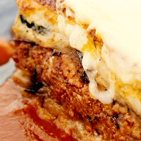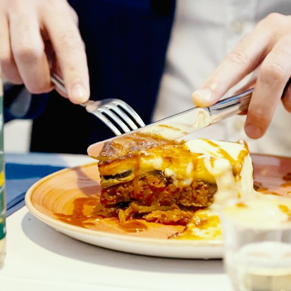 - Mousaka: capas de berenjena y calabacín con ragú de carne picada, bechamel, todo gratinado al horno.