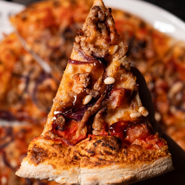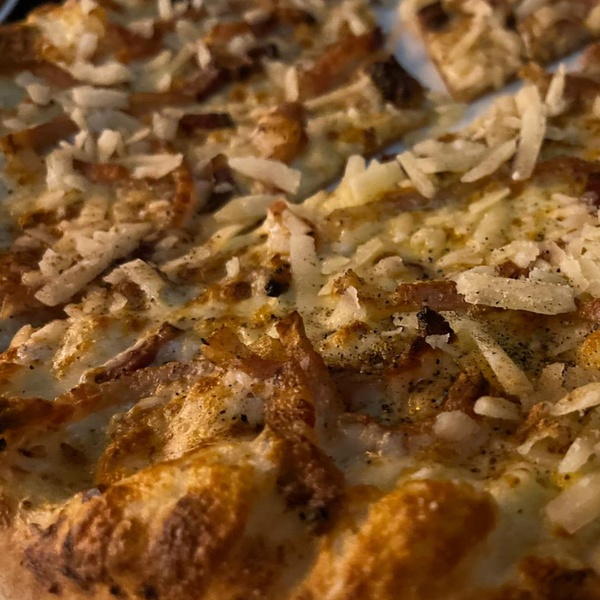 - Carbonara: base con salsa carbonara, bacón crujiente, cebolla morada.