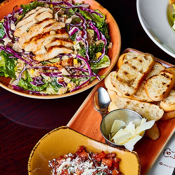 - Grilled Chicken Caesar Salad: pollo a la parrilla sobre lechuga romana con salsa César, Parmesano crujiente, picatostes y láminas de queso Parmesano.