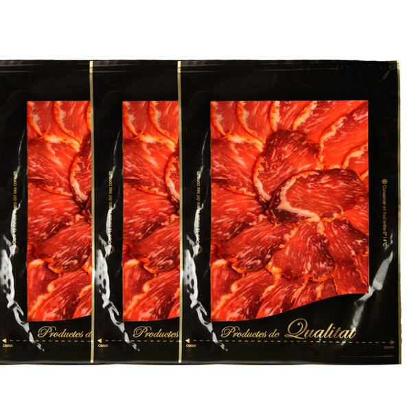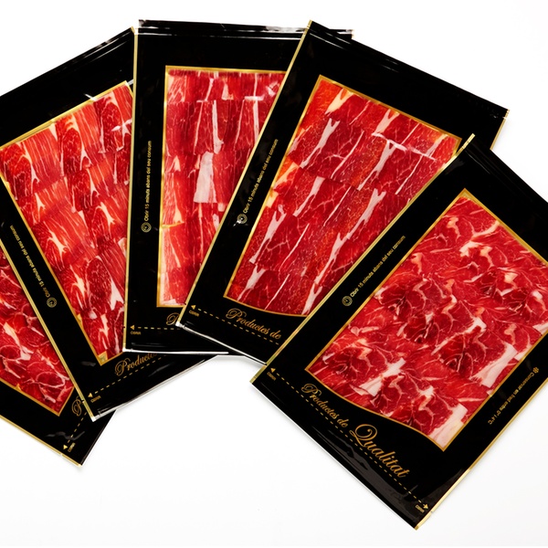 Sobres de jamón ibérico de bellota o caña de lomo envasados al vacío, seleccionados en el momento óptimo de corte y consumo