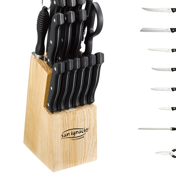 Este juego con gran variedad de cuchillos de acero y otros utensilios como tijeras, afilador y soporte es ideal para varios usos culinarios