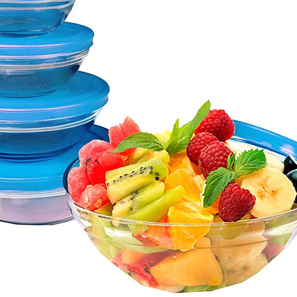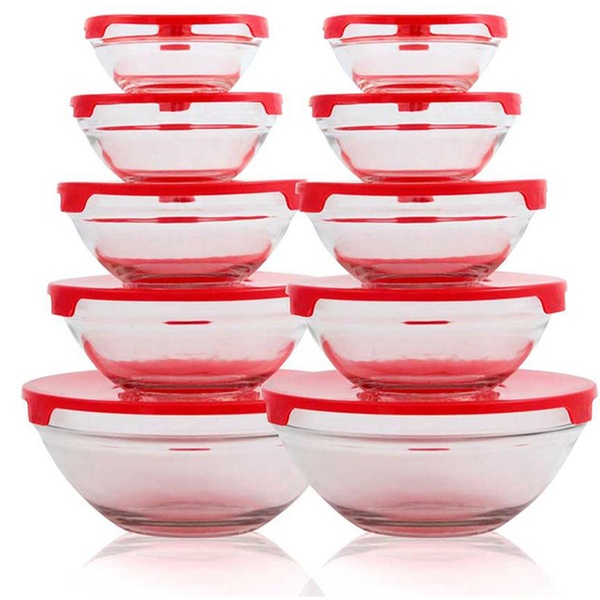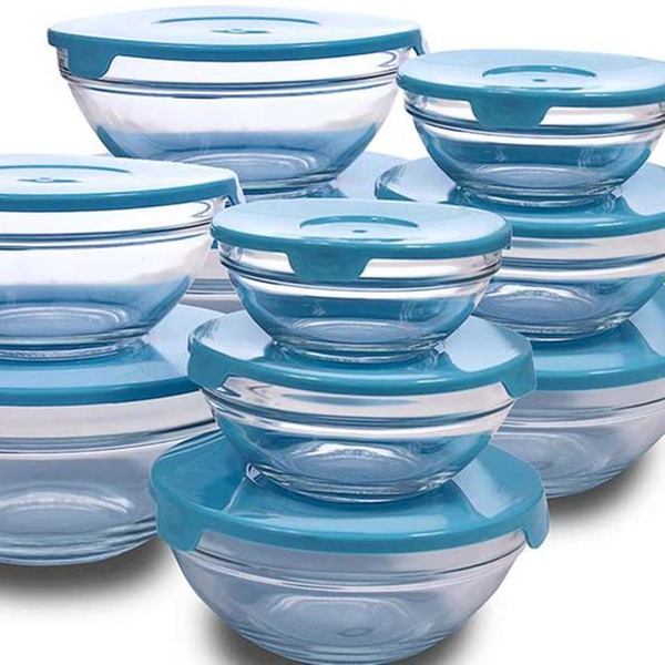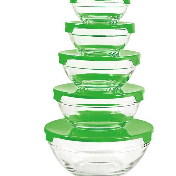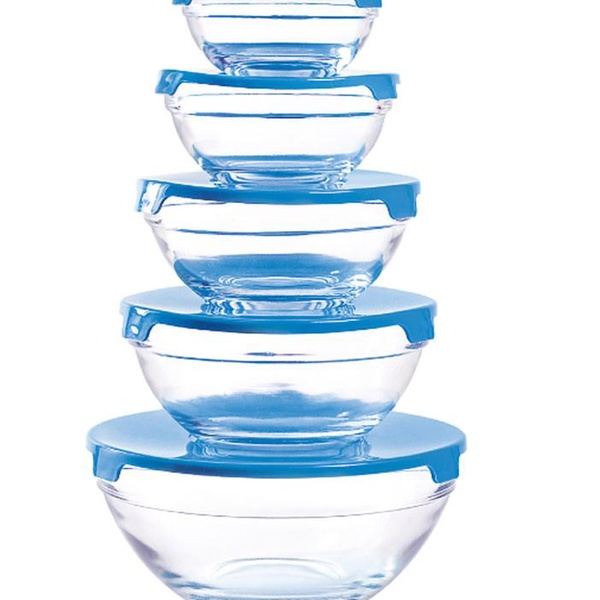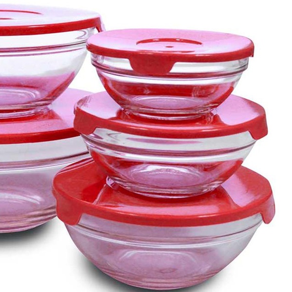 - Cinco recipientes de vidrio de diferentes tamaños con tapa a juego