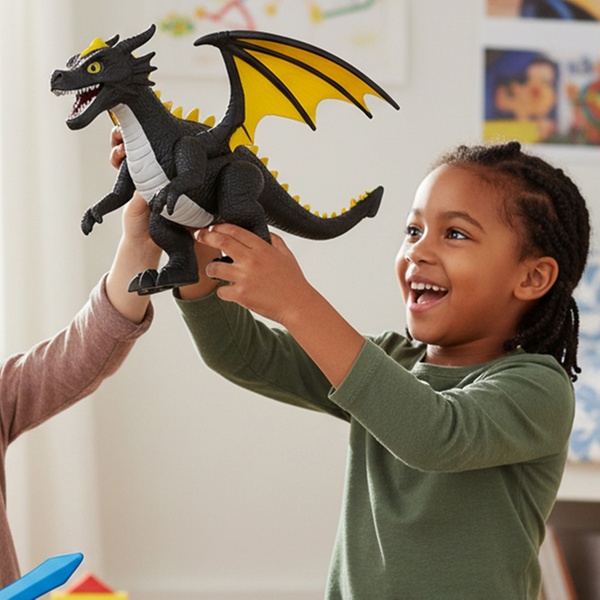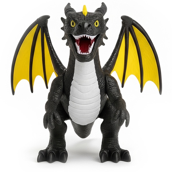 - Mide aproximadamente 35 cm y combina detalles realistas: cuerpo esculpido, escamas texturadas, ojos luminosos y garras afiladas