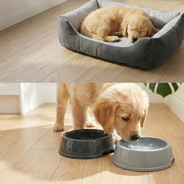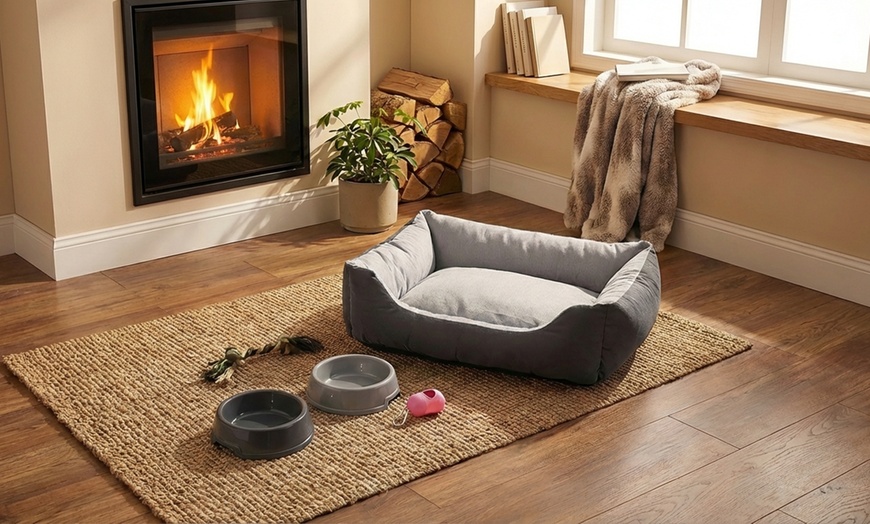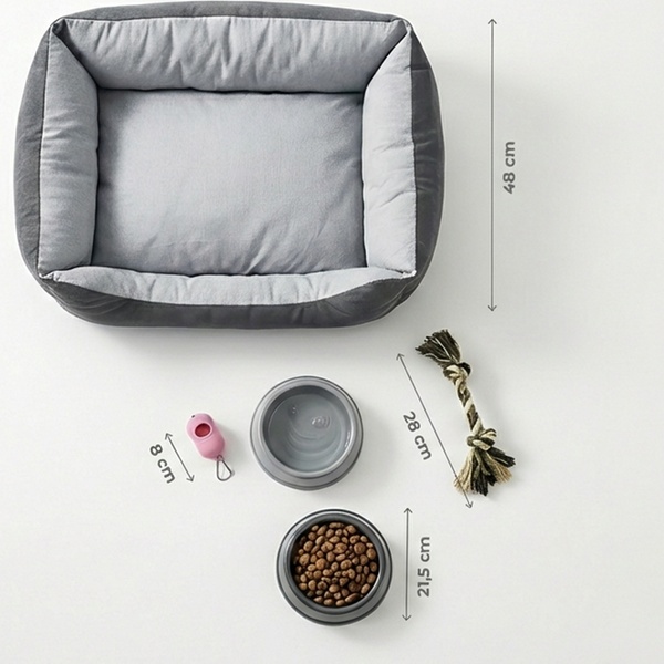 Groupon ofrece este kit completo de accesorios para perros con cama, cuencos y juguete, vendido por Il Gruppone SRL
