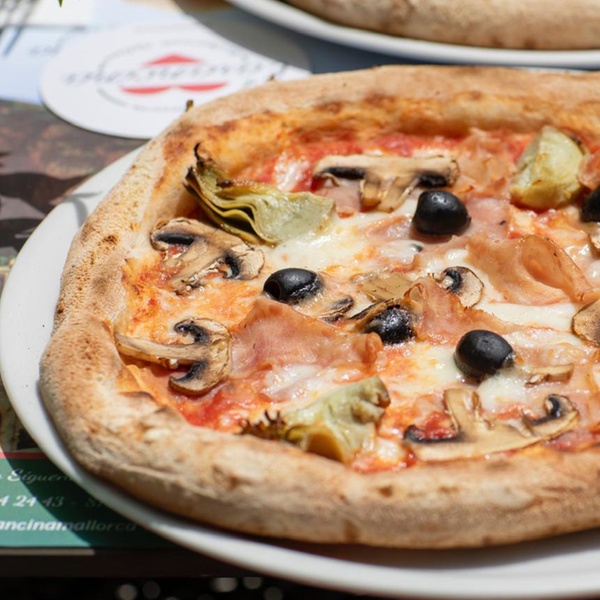 - Pizza Capricciosa: con salsa de tomate, queso mozzarella, champiñones, jamón, alcachofas y aceitunas.