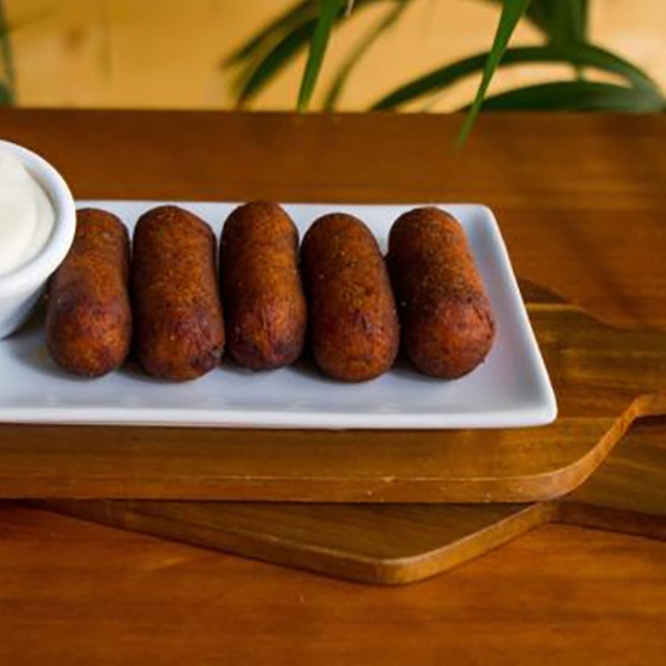 Tequeyoyos: deditos de queso fresco envueltos en una fina masa de plátano macho maduro (sin gluten), servidos con nata criolla (sour cream) (ración de 5 uds)