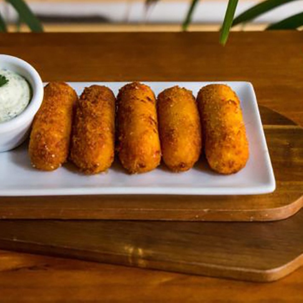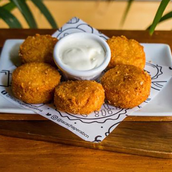 Tequechapas: deditos de queso fresco envueltos en una fina masa de maíz crujiente (sin gluten), servidos con salsa tártara (mayonesa de ajo y cilantro) (ración de 5 Uds)