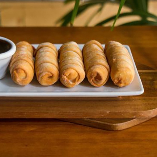 Tequeños tradicionales: deditos de queso fresco envueltos en una fina masa de hojaldre, servidos con melao de papelón (reducción de azúcar de caña en bloque y especias) (ración de 5 uds)
