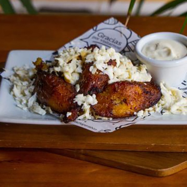 Tajadas con queso: lonchas de plátano macho maduro frito, servidas con topping de queso llanero venezolano rallado, acompañadas de nata criolla (sour cream) (ración de aproximadamente 6 tajadas)