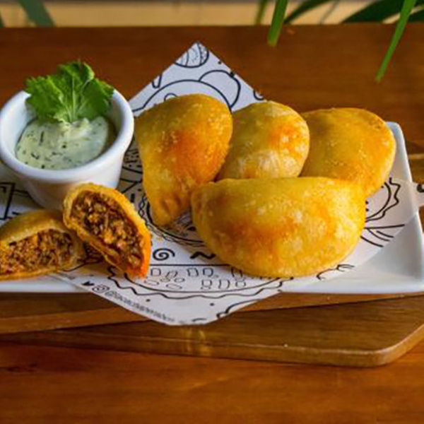 Mini pastelitos maracuchos: elaborados con masa de hojaldre, disponibles en 4 rellenos: carne molida (100% ternera picada) o pollo mechado (pollo guisado deshilachado), papa con queso (patatas con queso fresco fundido) o veganos (guiso de garbanzos) (ración de 5 uds del mismo relleno) servidos con salsa tártara (mayonesa de ajo y cilantro)