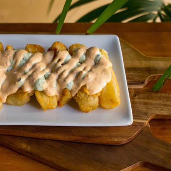 Yuquitas bravas: palitos de yuca frita crujientes, acompañados de salsa brava de la casa y salsa tártara al estilo ''calle del hambre venezolana''