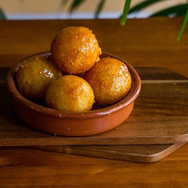 Buñuelos de yuca: bolitas de yuca amasadas con queso llanero venezolano, servidas con topping de melao de papelón (reducción de azúcar de caña y especias) (ración de 5 uds)