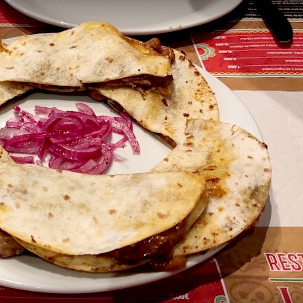 Pastor/Gringa: queso de Oaxaca con pastor y tortilla de trigo