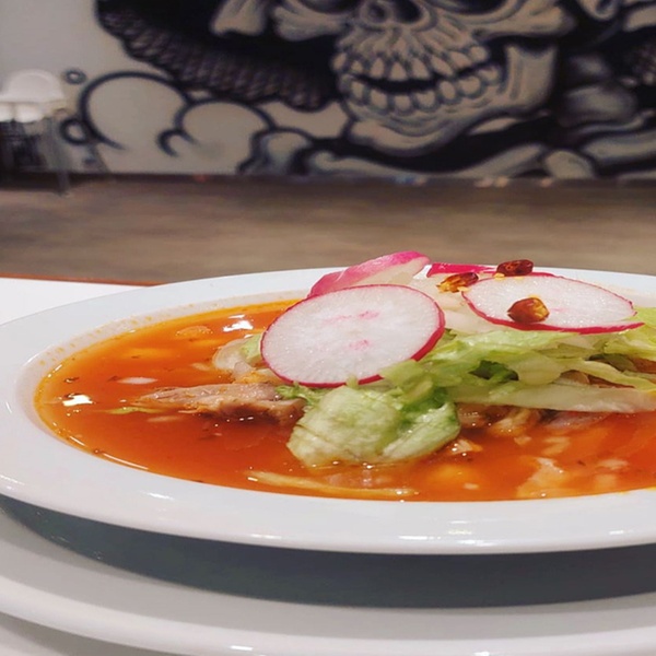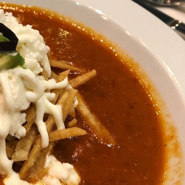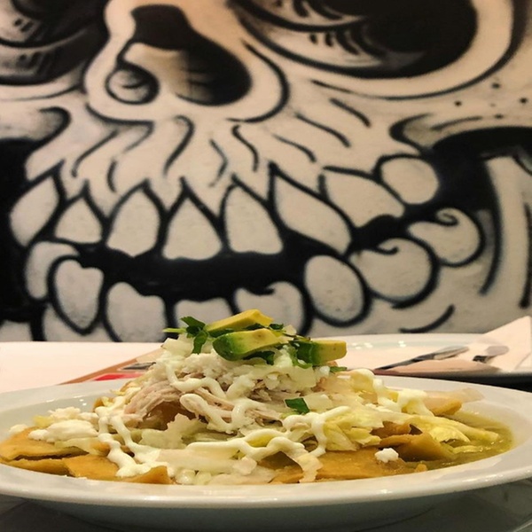 Tortilla frita y bañada en nuestra salsa especial de chile morita, con epazote y especias, acompañados con pollo deshebrado o un huevo frito, con crema y queso cotija
