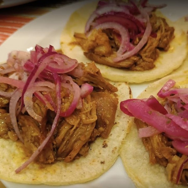 Tortillas fritas con frijoles, cochinita pibil, cebolla morada y nuestra salsa de habanero