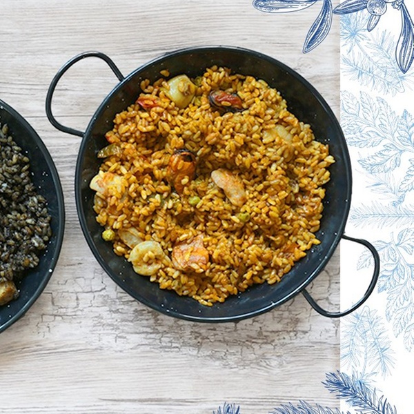 - Un menú mediterráneo para 2 personas con paleta ibérica de cebo, una paella para compartir, dos raciones, cesta de pan y dos bebidas.