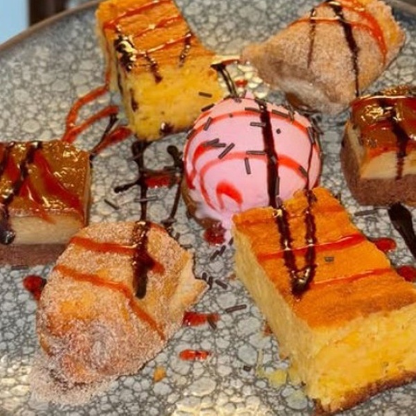 - Pan de elote: delicioso bizcocho de maíz dulce acompañado de jalea de chocolate, jalea de fresa y virutas de chocolate