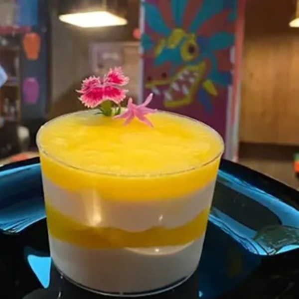 - Pastel imposible: delicioso bizcocho de chocolate con flan y una capa de dulce de leche, acompañado de jalea de chocolate, jalea de fresa y virutas de chocolate