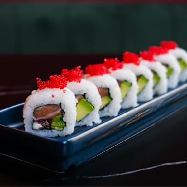 • California roll: Relleno de atún, salmón, aguacate, mayonesa Japonesa y Tobiko