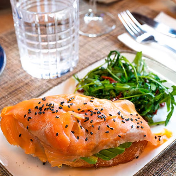 • Tostada de hogaza de pan, aguacate, salmón, rúcula y AOVE