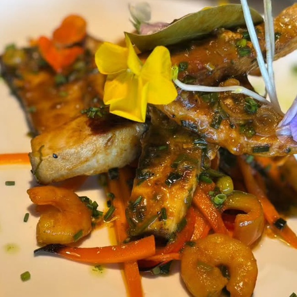 - Tataki de atún: rebozado en soja, aceite de oliva, sésamo, acompañado de crudités de fruta aliñados con miel y vinagre de arroz (suplemento de 4 €)