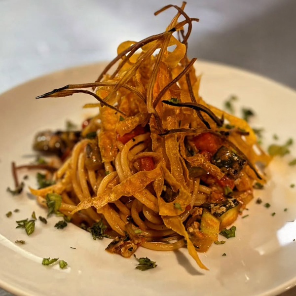 - Spaghetti alla norma: tomate cherry, salsa de tomate, berenjena, pimienta, albahaca, y queso parmesano