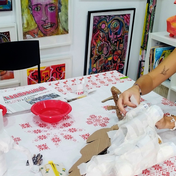 El taller permite aprender técnicas de papel maché en cuatro clases de 1.30 h cada una. Los participantes trabajan con materiales reciclados y transforman estos materiales en esculturas propias.
