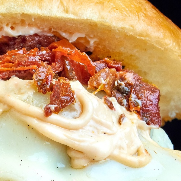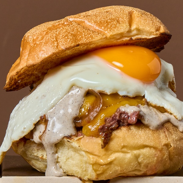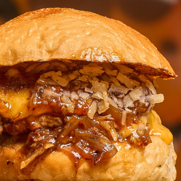 - Burger Trufada: doble de carne (90 g. cada una), doble de cheddar, mayo de trufa, cebolla caramelizada y huevo frito.
