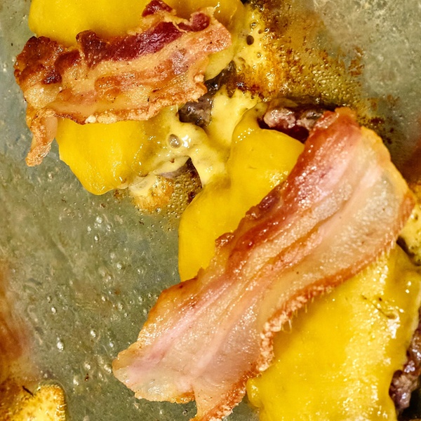 - Burger Oklahoma: doble de carne (90 g. cada una), queso cheddar, bacon, salsa de huevo frito y cebolla smasheada.
