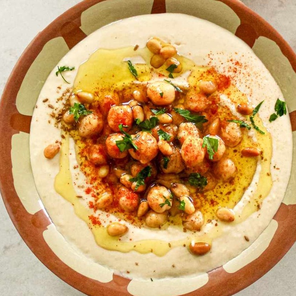 - Crema de hummus: crema de garbanzos ecológicos aliñados con aceite de oliva, tahini, zumo de limón, un toque de ajo y especias, acompañada de bastoncillos de verduras frescas.