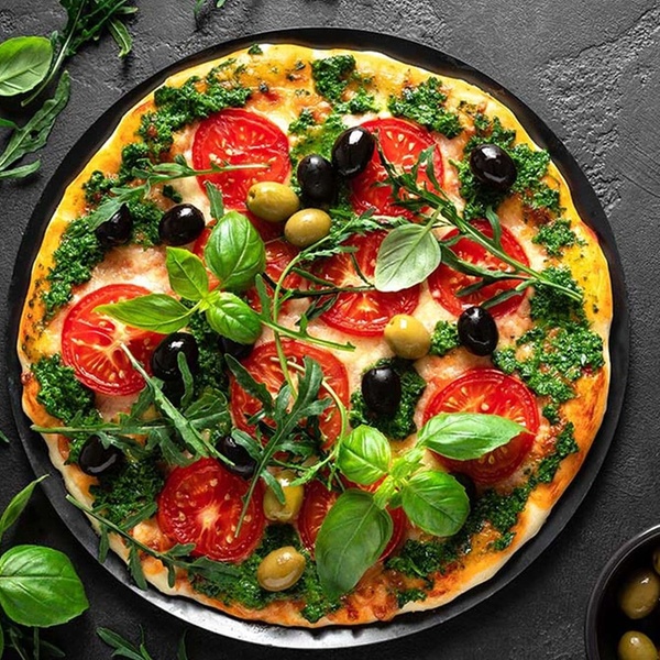 Disfruta de un menú vegetariano único con deliciosas pizzas y platos inspirados en el Mediterráneo que deleitarán tus sentidos