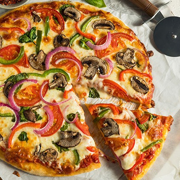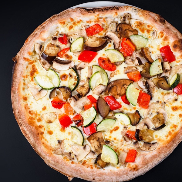 - Vegetariana: masa fina de harina integral, salsa de tomate casero, mozzarella, champiñones, berenjenas, calabacines y pimientos, aliñada con aceite de albahaca y/o ajo según su preferencia.