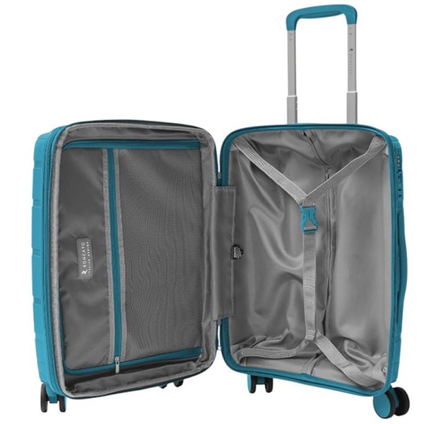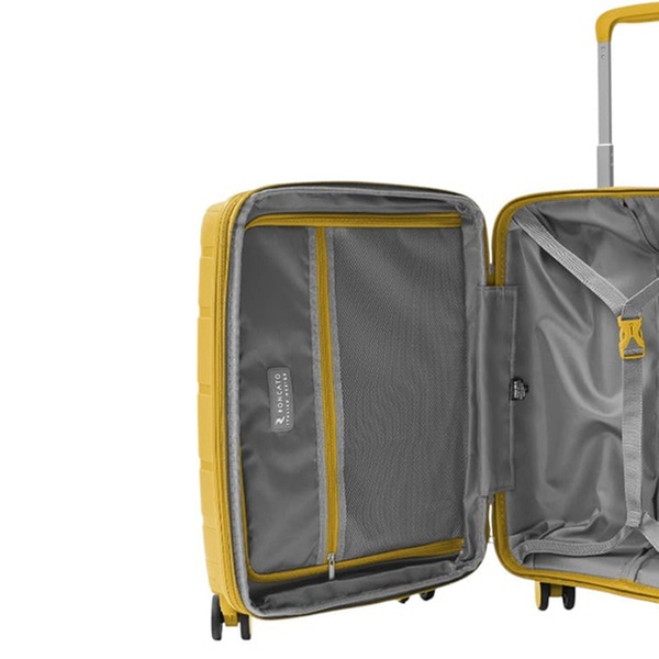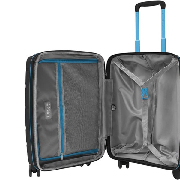 - El interior incluye una distribución organizada con separador, correas para prendas y patas laterales con gancho