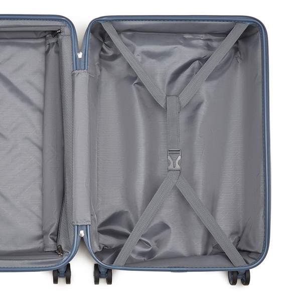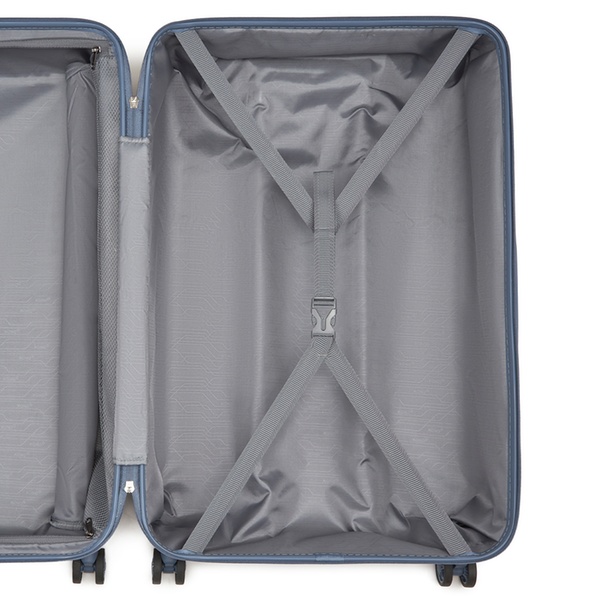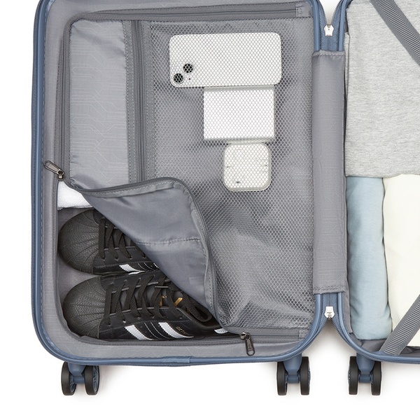 • El compartimento principal cuenta con correas con una hebilla para sujetar el contenido por un lado, mientras que el otro lado se asegura con una cremallera para un equipaje organizado. Además, hay un pequeño bolsillo de malla