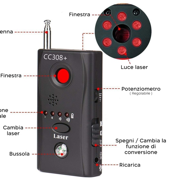 Seguridad eléctrica Carga: Utilice únicamente el cargador suministrado para la recarga. El uso de un adaptador no estándar o dañado puede provocar un mal funcionamiento del dispositivo, problemas con la batería o riesgos eléctricos. Voltaje: El dispositivo funciona con una alimentación de 110-240 V. Asegúrese de utilizarlo con la fuente de alimentación adecuada y con un adaptador adecuado si viaja al extranjero. Mantener seco: El dispositivo no es impermeable. Evite utilizarlo en entornos húmedos o mojados, ya que la humedad puede dañar los componentes electrónicos internos y provocar cortocircuitos. 2. Uso y manipulación correctos Componentes frágiles: El dispositivo contiene componentes electrónicos sensibles, entre ellos un láser y una lente óptica. Evite dejar caer la unidad o someterla a fuertes golpes, ya que esto podría comprometer su capacidad de detección. Seguridad del láser: El láser se utiliza para una función específica. Nunca apunte el láser directamente a personas o animales, ya que puede ser perjudicial para los ojos. Batería: El dispositivo está equipado con una batería recargable. No lo exponga a altas temperaturas ni a la luz solar directa durante períodos prolongados, ya que esto puede dañarlo y provocar riesgos de incendio. 3. Mantenimiento y conservación Limpieza: Utilice un paño suave y seco para limpiar el dispositivo. No utilice disolventes químicos ni detergentes abrasivos, ya que podrían dañar la superficie o la lente óptica. Conservación: Guarde el dispositivo en un lugar fresco y seco, lejos de temperaturas extremas. Si no se utiliza durante un periodo prolongado, es recomendable cargarlo completamente antes de guardarlo y recargar la batería periódicamente para mantenerla en buen estado. Siguiendo estas sencillas pautas de seguridad, el dispositivo funcionará correctamente y con total seguridad, garantizando una protección fiable para su privacidad.