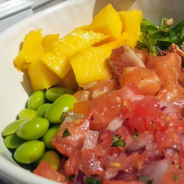 Poke de salmón con edamame, guacamole, mango, pico de gallo, wakame, anacardos garapiñados y arroz de sushi