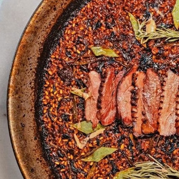 - Nido de sepia sobre falso risotto de sémola de trigo en su tinta
