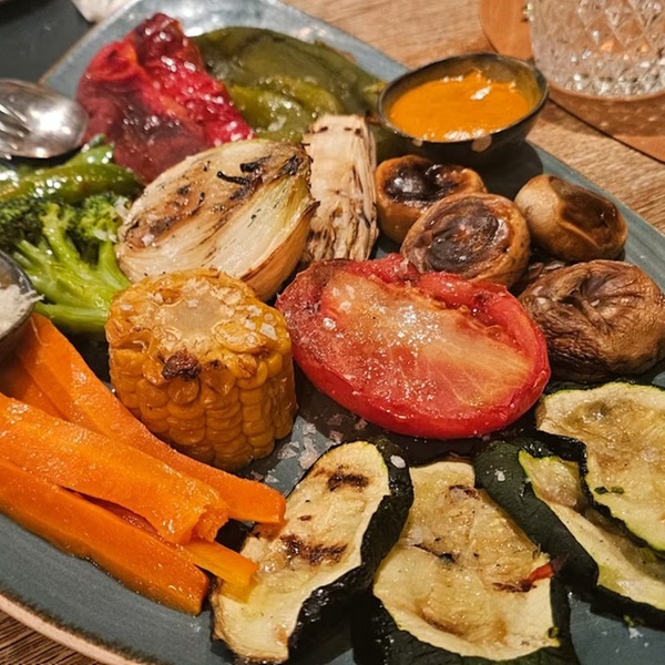 - Parrillada de verduras de temporada al carbón de encina con salsa romescu