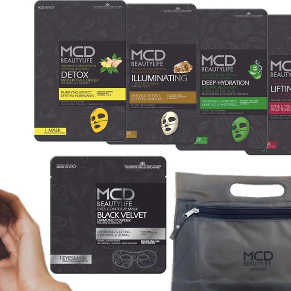 La oferta incluye mascarillas de hidrogel con agua glacial de los Alpes, oro 24K, aloe vera orgánico, colágeno natural y ácido hialurónico, todas con fórmulas innovadoras que protegen, iluminan, hidratan y tonifican la piel, sin necesidad de enjuague y con fácil aplicación anatómica