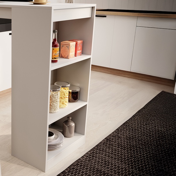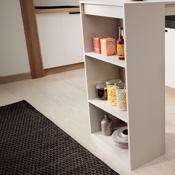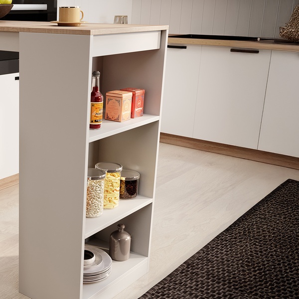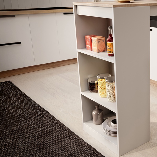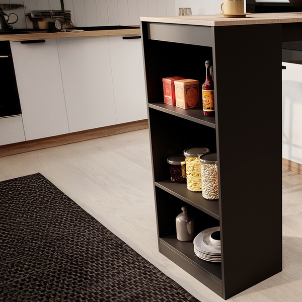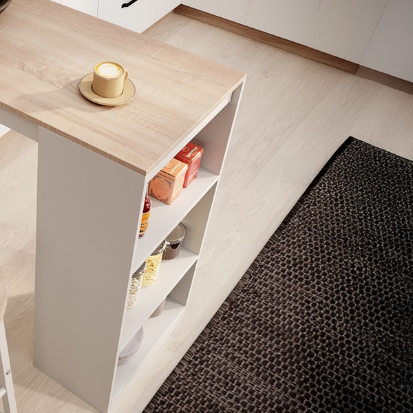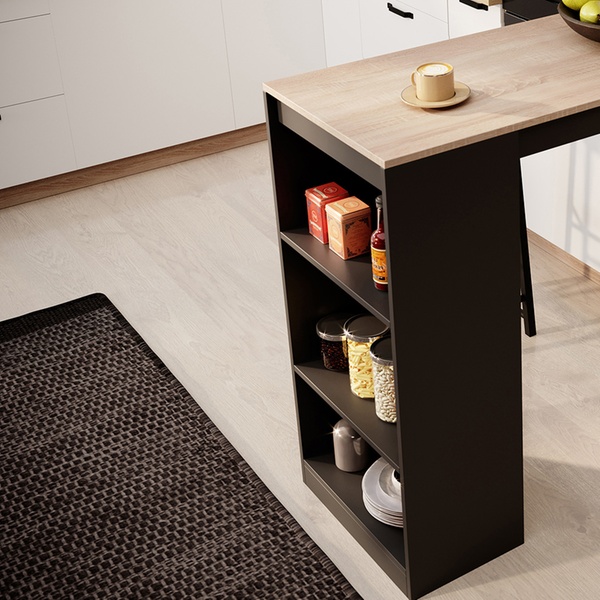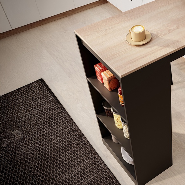 - Además, cuenta con tres compartimentos laterales en color efecto madera sonoma que te ofrecen un espacio de almacenamiento extra, perfecto para tener a mano tus objetos más preciados o para colocar tus libros de cocina.