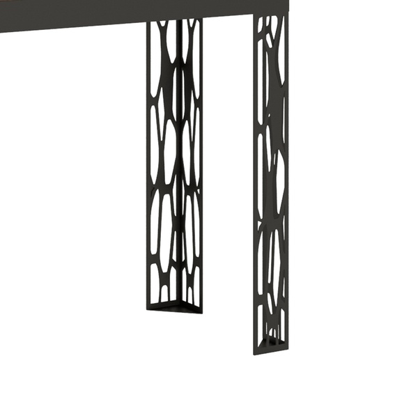 Una mesa consola extensible con estructura de hierro y patas perforadas, con un estilo moderno y original