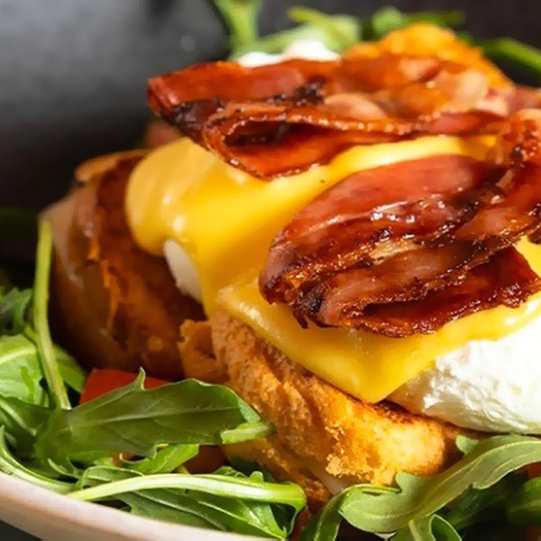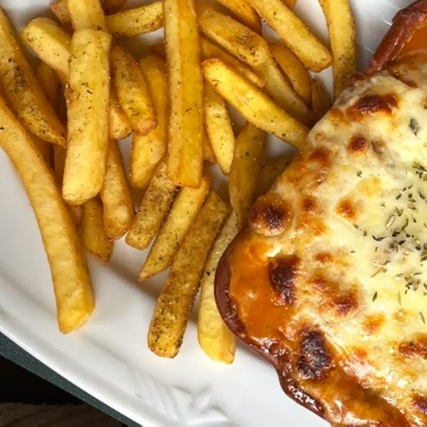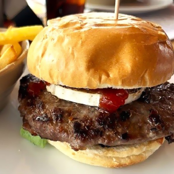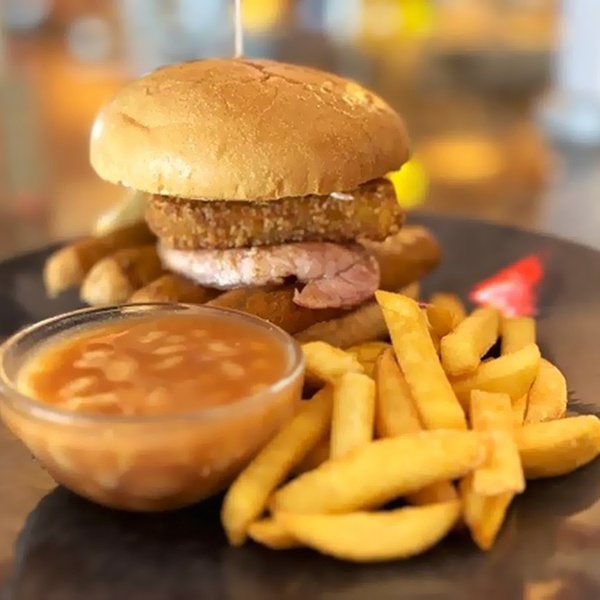 - Hamburguesa BBQ con patatas fritas: salsa BBQ Black Jack, cebolla crujiente, queso y bacon
