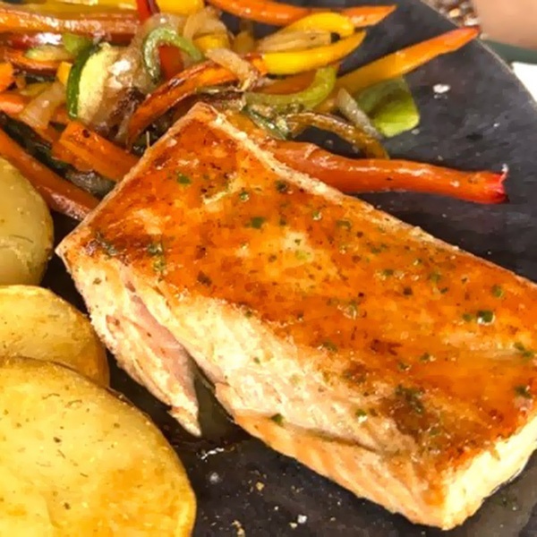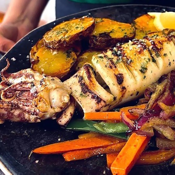 - Pollo a la plancha con queso caramelizado de cabra, patatas y verduras wok