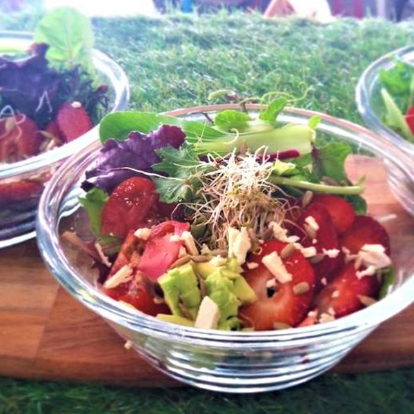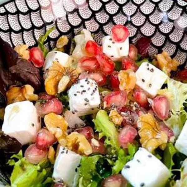 Ensalada de queso feta: tomate seco, oliva negra, queso feta y nueces