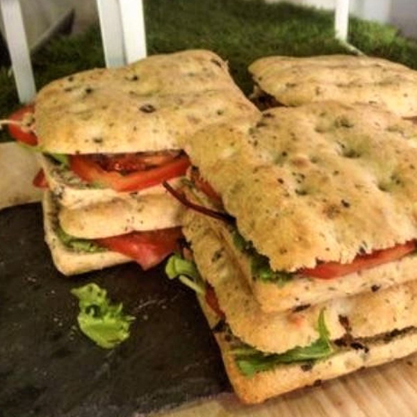 Pan de oliva: tomate en rodajas, mozzarella vegana, cebolla frita y salsa pesto en pan de focaccia con aceitunas