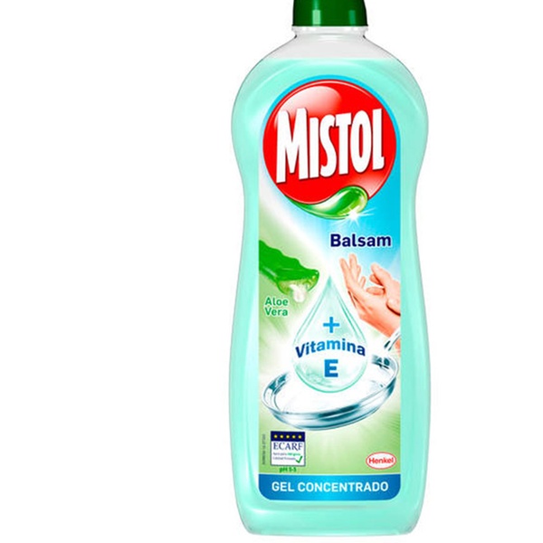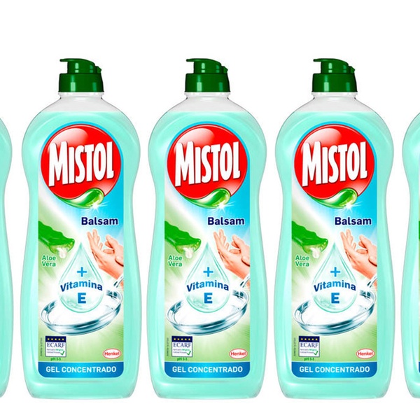 Un pack de 6 botellas de Mistol aloe vera, ideal para limpiar la vajilla y cuidar las manos al mismo tiempo