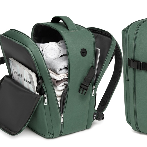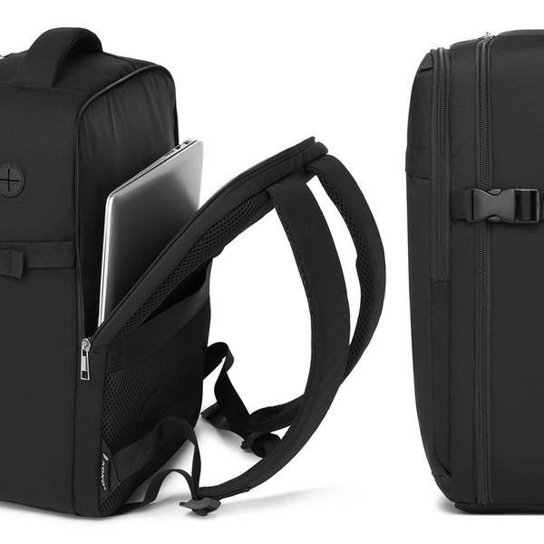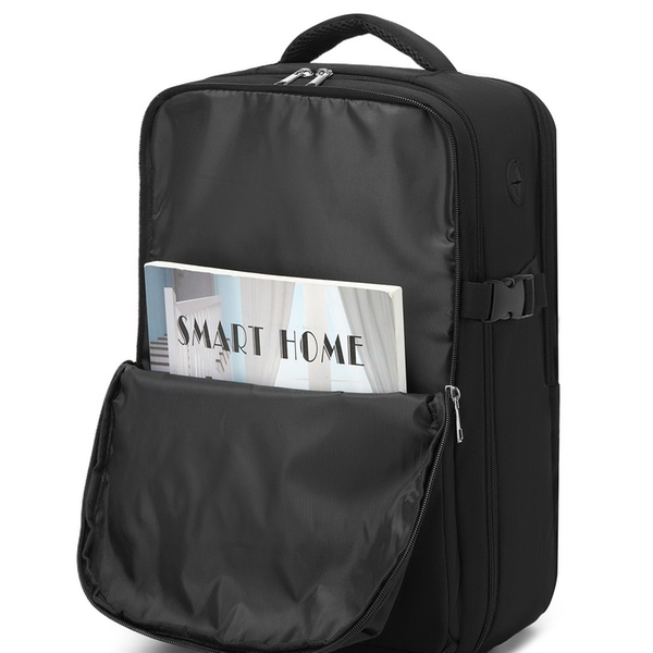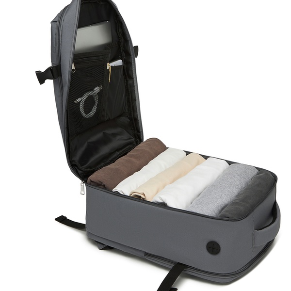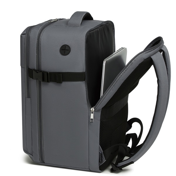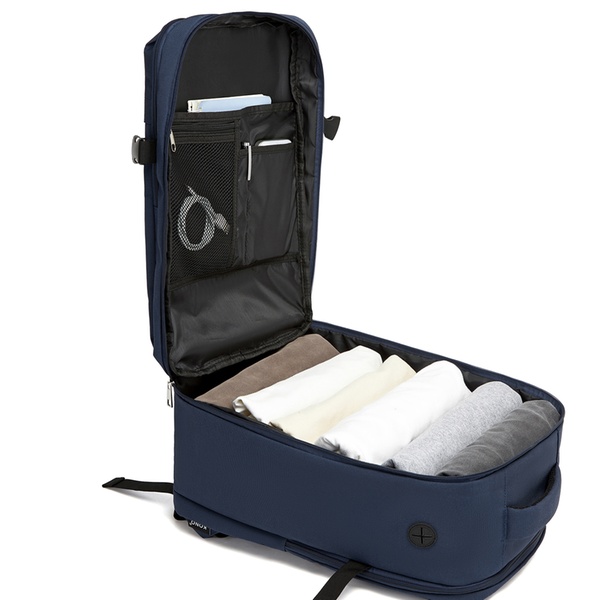 - Compartimento central tipo maleta con bolsillos de malla y deslizantes, espacio para bolígrafos y power bank