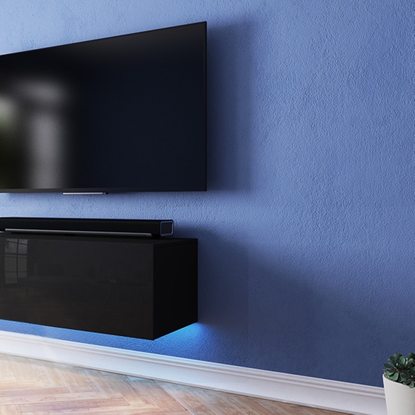 Un mueble de televisor con diseño flotante y luz LED, disponible en varios acabados